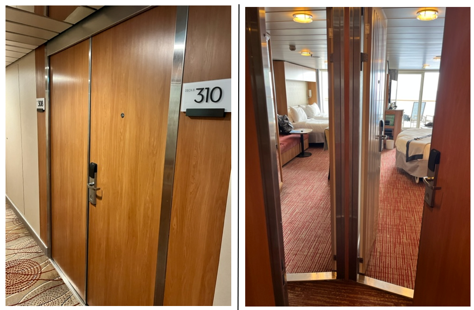The layout of the cabins is typical for a cruise ship. We stayed in a balcony cabin on deck 8 towards the rear of the ship and had a connecting door with the next-door cabin. Connecting cabins are unique on Celebrity where the connecting door is on the outside of the cabins (see images below). A complaint we had with the cabin was the way the bathroom door swung – it would have been better to have the door swing open where you could step into the majority of the cabin, but instead it opened where you had to step towards the hallway door and go around the bathroom door to get to the bed and other part of the cabin. The shower stall had glass doors and full-size shampoo, condition, and shower gel were provided. There was a blow dryer for use, but it couldn’t plug into the bathroom outlet so you had to use it by the desk out in the main cabin. We found the cabin to have plenty of storage space in the bathroom, but would have liked more drawers/bigger drawers in the bedroom. The cabinet above the bed opens for more storage. Balconies are a decent size with two chairs and a table. If you have a connecting cabin, they can remove the divider on the balcony to make it one large balcony for the two cabins. Room stewards come in twice daily to freshen the cabin and they put chocolates on the pillows each evening. They also put beach towels in your cabin the night before docking which you can take off the ship to use in port.